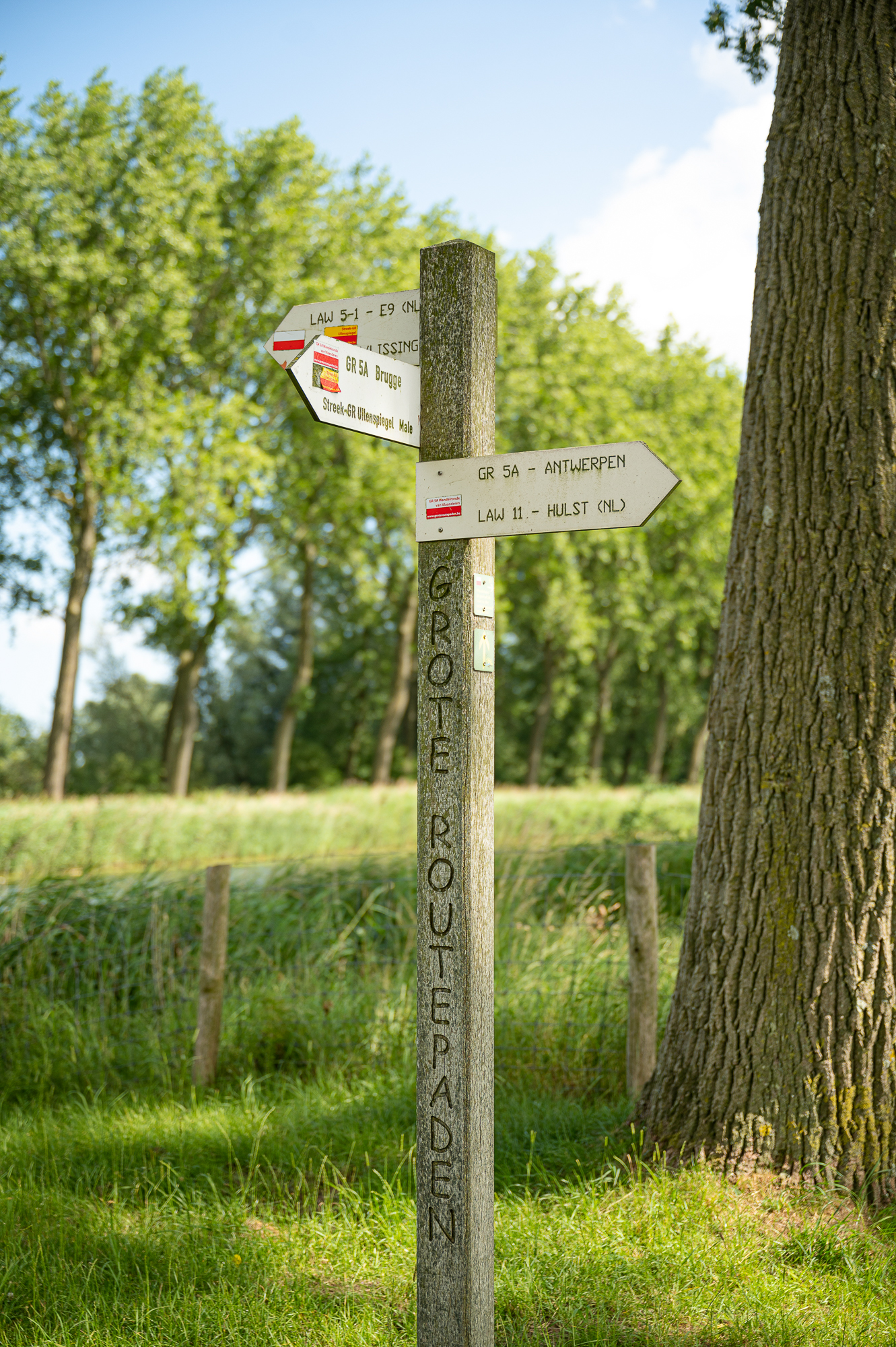 Eenmaal aan de overkant aangekomen, staan de routes goed bewegwijzerd. Hier kruizen namelijk meerdere lange afstandswandelingen elkaar. De route staat overal goed gemarkeerd met rood-witte markeringen, wat standaard is bij lange afstandswandelingen.